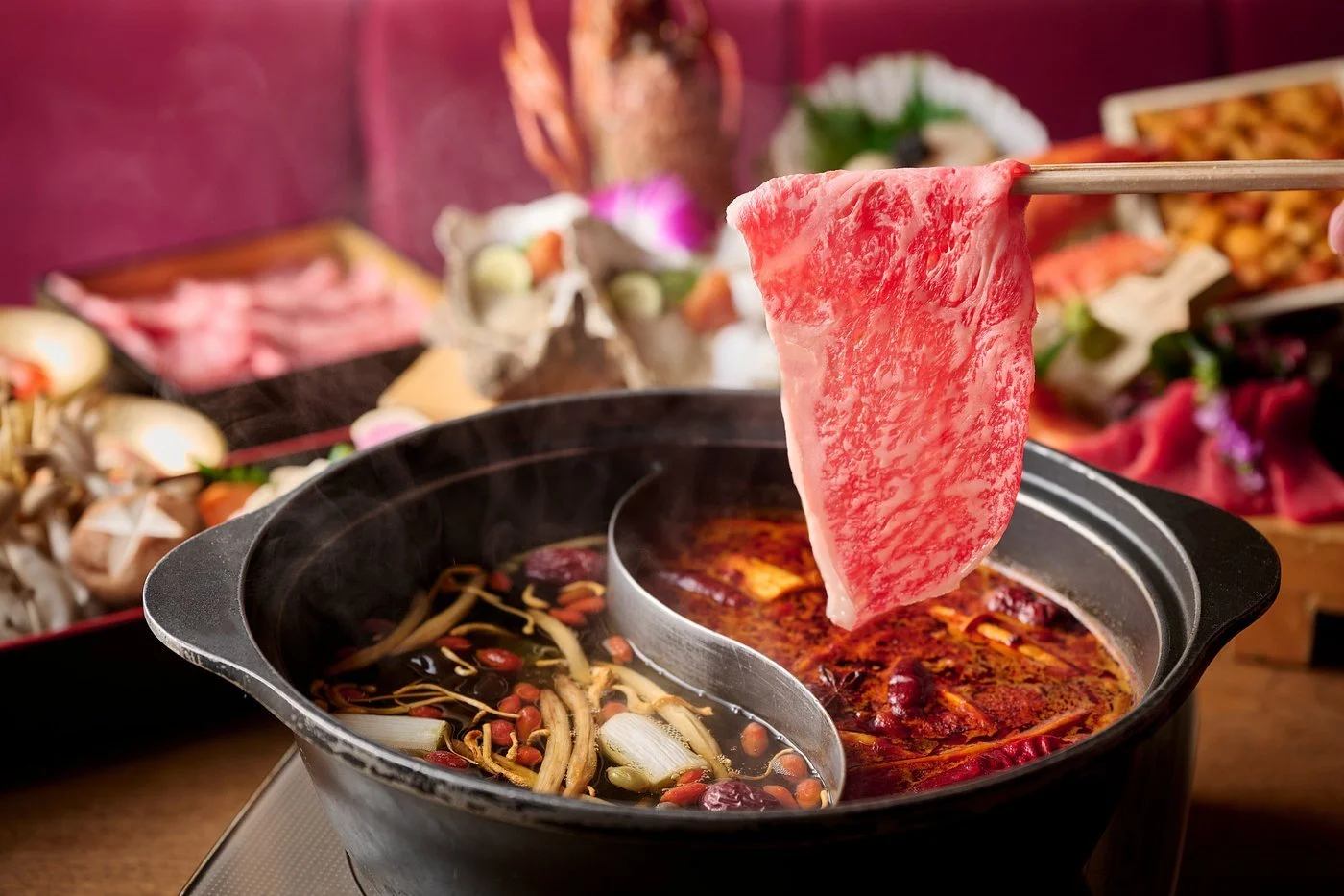 Enjoy a hearty hotpot meal that fills you up, while tasting the best of local produce. Start with plenty of fresh seafood sashimi, followed by Wagyu beef and pork served shabu shabu-style in a bubbling pot, excellent in quality and generous in portions.